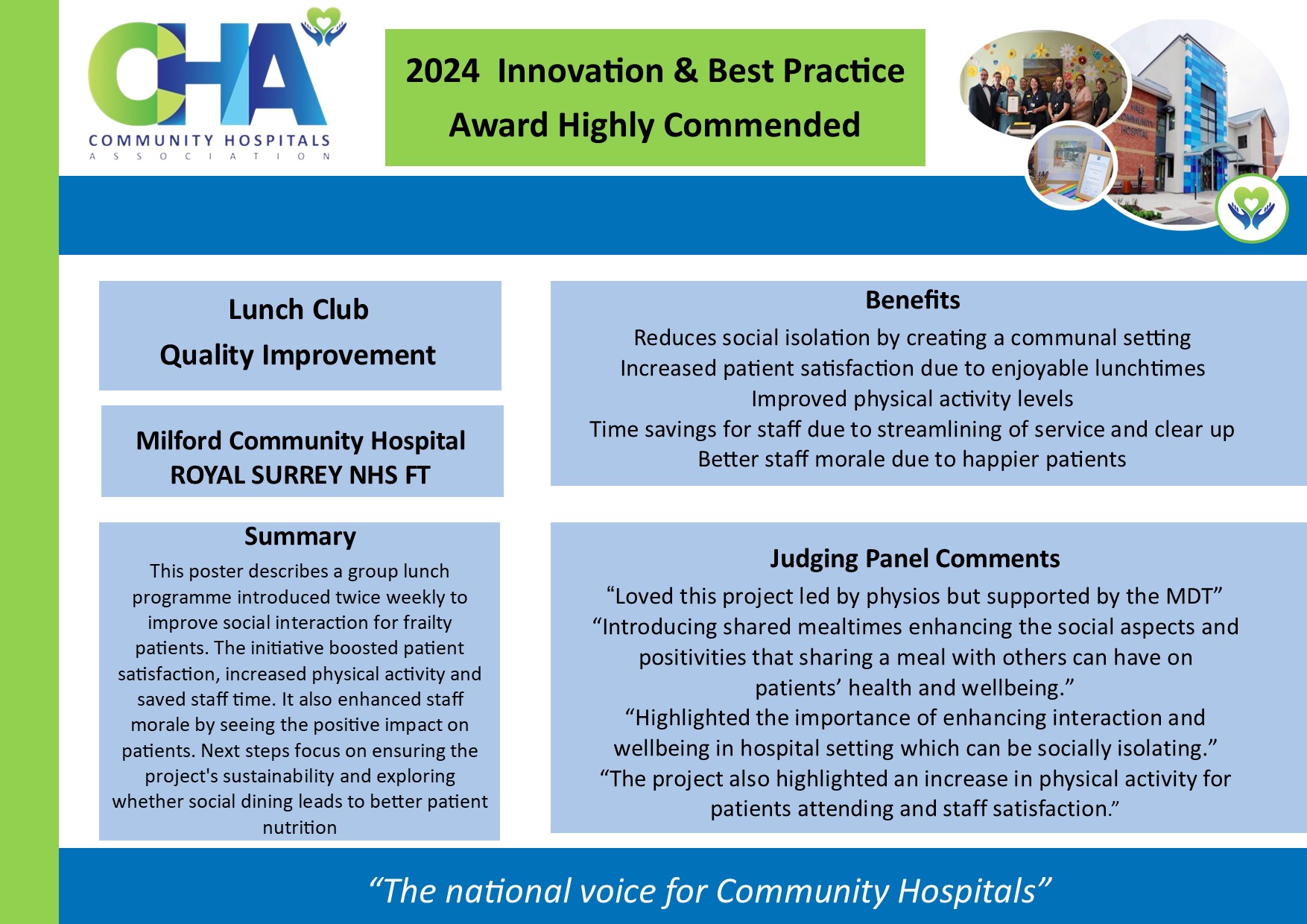 | “Lunch Club Quality Improvement” submitted by Maggie McDowell, Team Lead Physio at Milford Community Hospital, Royal Surrey NHS Foundation Trust. More details here. | ![]() |