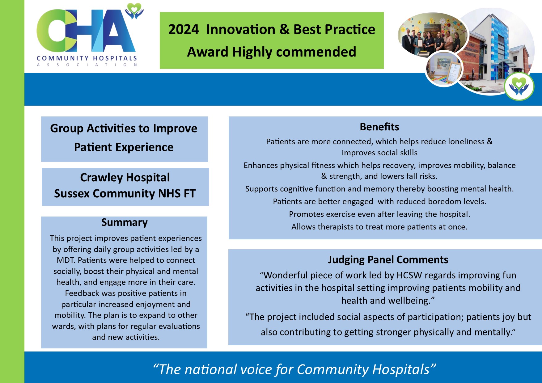 | “Group Activities to Improve Patient Experience,” submitted by Tracy Uwaechie, Healthcare Support Worker at Crawley Hospital, Sussex community NHS Foundation Trust. More details here. | ![]() |